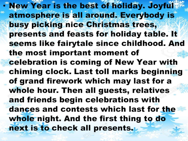 around. Everybody is busy picking nice Christmas trees, presents and feasts for holiday table. It seems like fairytale since childhood. And the most important moment of celebration is coming of New Year with chiming clock. Last toll marks beginning of grand firework which may last for a whole hour. Then all guests, relatives and friends begin celebrations with dances and contests which last for the whole night. And the first thing to do next is to check all presents.