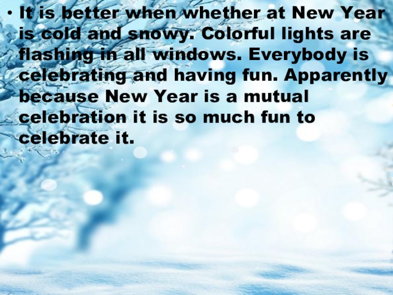 snowy. Colorful lights are flashing in all windows. Everybody is celebrating and having fun. Apparently because New Year is a mutual celebration it is so much fun to celebrate it.
