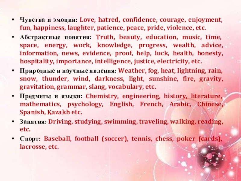 Абстрактные понятия: Truth, beauty, education, music, time, space, energy, work, knowledge, progress, wealth, advice, information, news, evidence, proof, help, luck, health, honesty, hospitality, importance, intelligence, justice, electricity, etc.