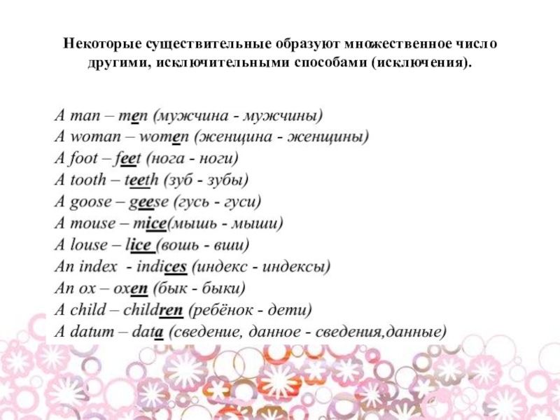Слайд 9Некоторые существительные образуют множественное число другими, исключительными способами (исключения).