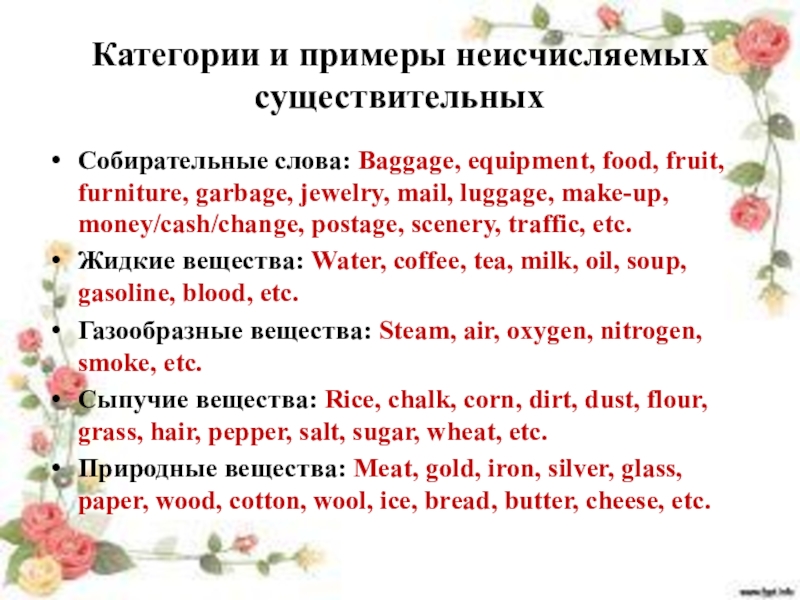 Слайд 3Категории и примеры неисчисляемых существительных