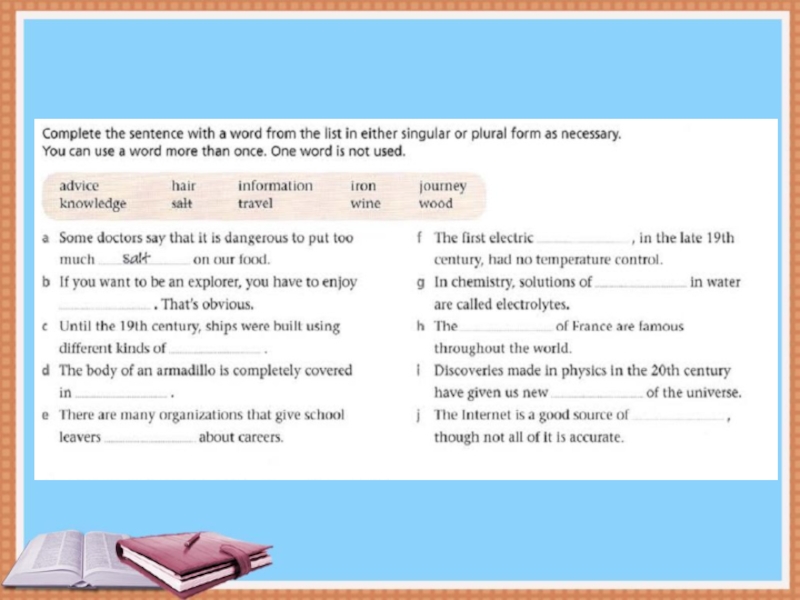 Неисчисляемые существительные употребляются только в единственном числе и без всяких окончаний.