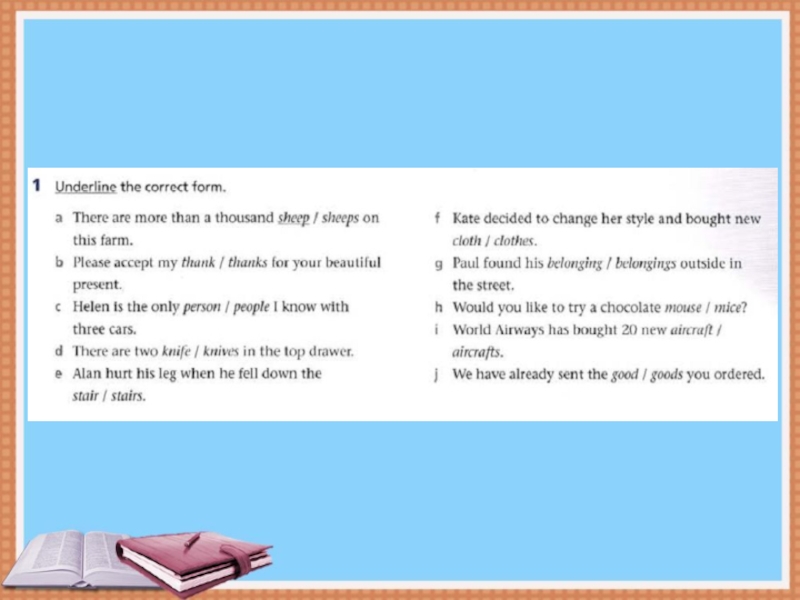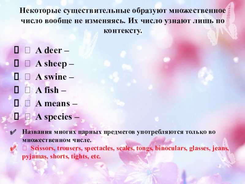 Слайд 11Некоторые существительные образуют множественное число вообще не изменяясь. Их число узнают