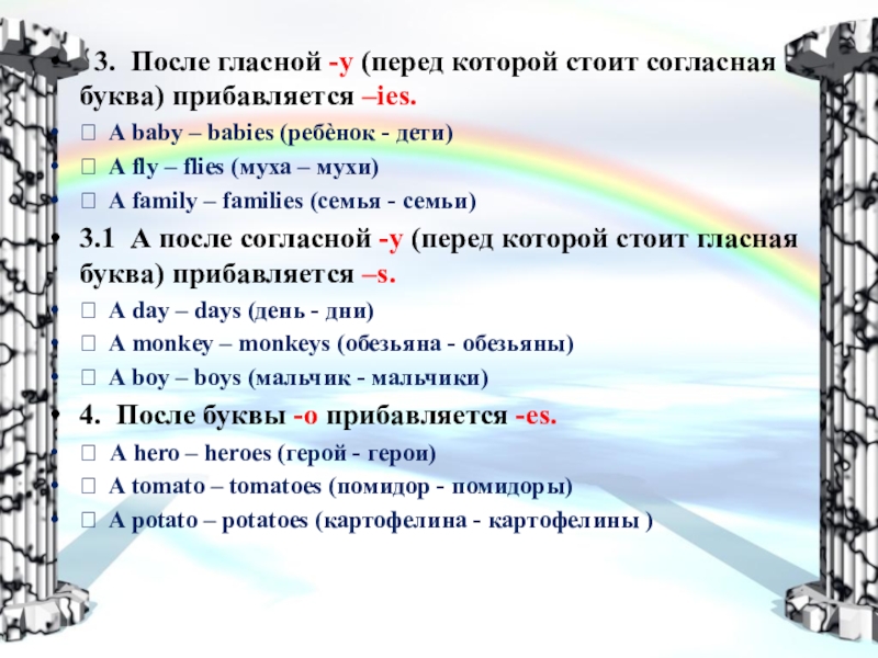 3.1 А после согласной -y (перед которой стоит гласная буква) прибавляется –s.