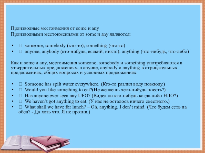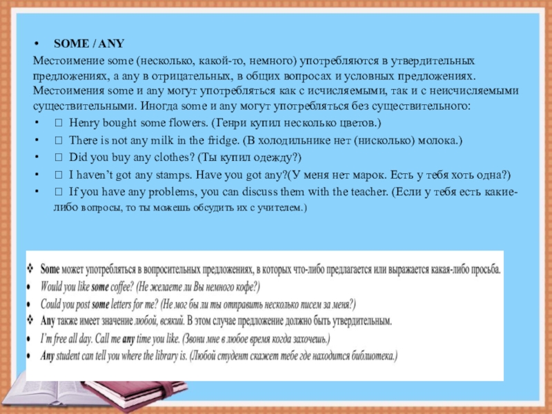 а any в отрицательных, в общих вопросах и условных предложениях. Местоимения some и any могут употребляться как с исчисляемыми, так и с неисчисляемыми существительными. Иногда some и any могут употребляться без существительного: