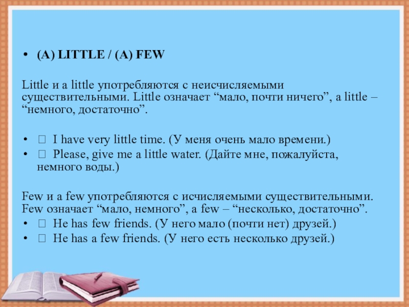 существительными. Little означает “мало, почти ничего”, a little – “немного, достаточно”.