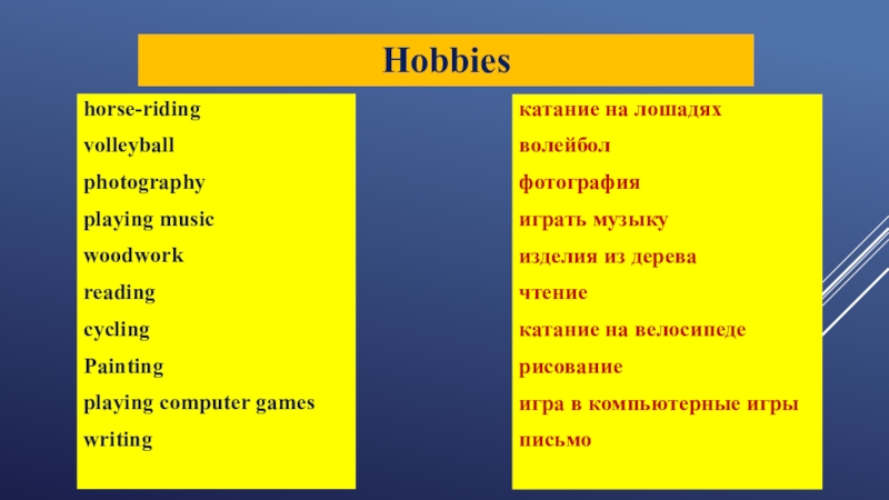 horse-ridingvolleyballphotographyplaying musicwoodworkreading cyclingPaintingplaying computer gameswritingHobbies катание на лошадяхволейбол фотографияиграть музыкуизделия из деревачтение катание на велосипедерисование игра в