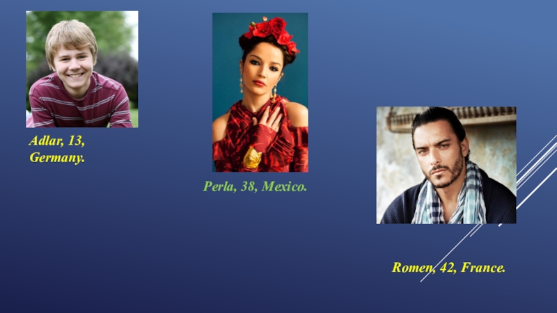 Adlar, 13, Germany.Perla, 38, Mexico.Romen, 42, France.