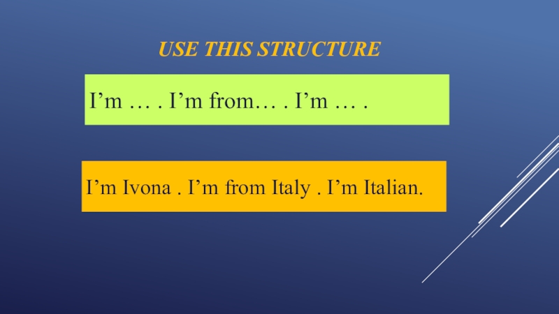 Use this structureI’m … . I’m from… . I’m … .I’m Ivona . I’m from Italy .