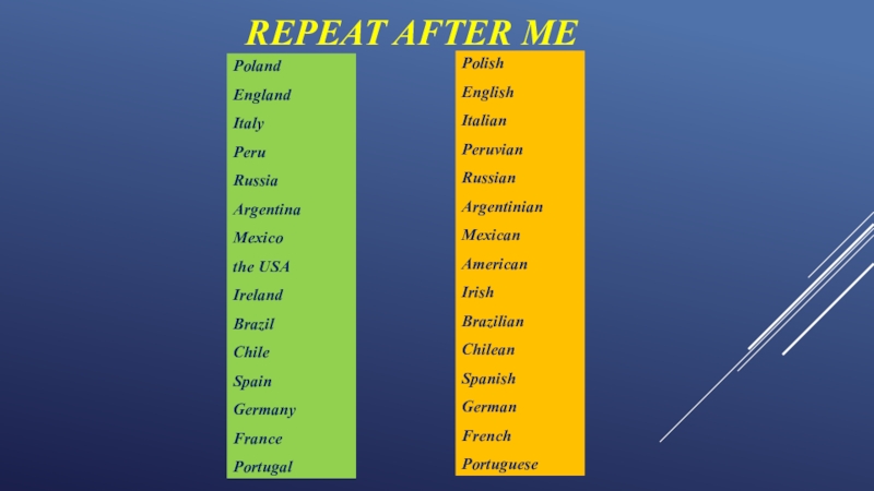 Repeat after me Poland EnglandItalyPeruRussiaArgentinaMexicothe USAIrelandBrazilChileSpainGermanyFrancePortugalPolish EnglishItalianPeruvianRussianArgentinianMexicanAmerican IrishBrazilianChileanSpanishGermanFrenchPortuguese