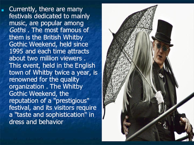 Currently, there are many festivals dedicated to mainly music, are popular among Goths . The most famous