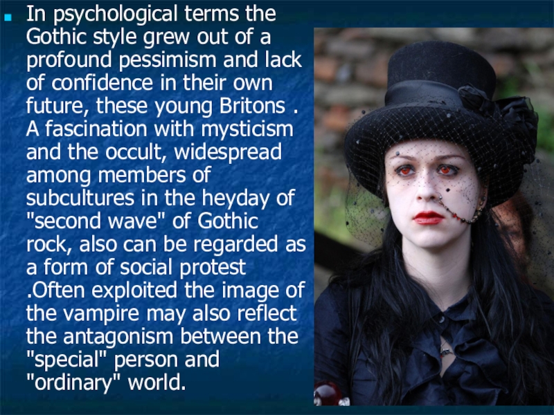 pessimism and lack of confidence in their own future, these young Britons . A fascination with mysticism and the occult, widespread among members of subcultures in the heyday of "second wave" of Gothic rock, also can be regarded as a form of social protest .Often exploited the image of the vampire may also reflect the antagonism between the "special" person and "ordinary" world.