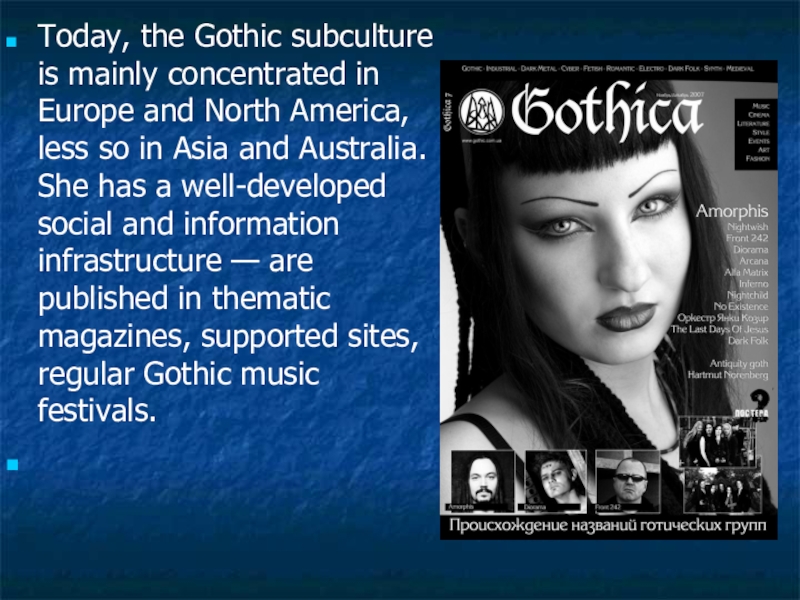 America, less so in Asia and Australia. She has a well-developed social and information infrastructure — are published in thematic magazines, supported sites, regular Gothic music festivals.