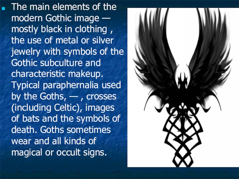 in clothing , the use of metal or silver jewelry with symbols of the Gothic subculture and characteristic makeup. Typical paraphernalia used by the Goths, — , crosses (including Celtic), images of bats and the symbols of death. Goths sometimes wear and all kinds of magical or occult signs.