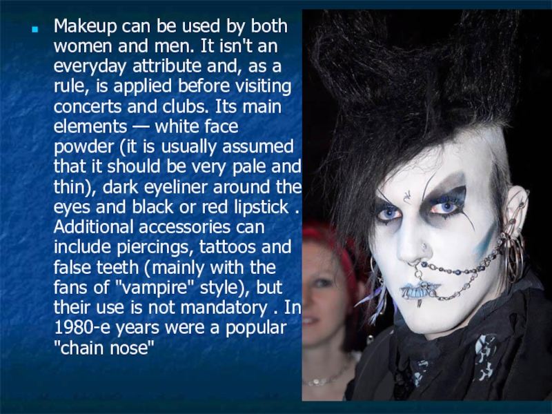an everyday attribute and, as a rule, is applied before visiting concerts and clubs. Its main elements — white face powder (it is usually assumed that it should be very pale and thin), dark eyeliner around the eyes and black or red lipstick . Additional accessories can include piercings, tattoos and false teeth (mainly with the fans of "vampire" style), but their use is not mandatory . In 1980-e years were a popular "chain nose"