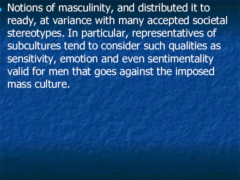 many accepted societal stereotypes. In particular, representatives of subcultures tend to consider such qualities as sensitivity, emotion and even sentimentality valid for men that goes against the imposed mass culture.