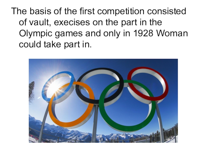 The basis of the first competition consisted of vault, execises on the part in the Olympic games