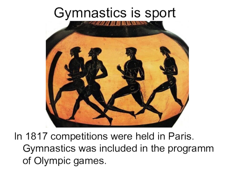 Gymnastics is sportIn 1817 competitions were held in Paris. Gymnastics was included in the programm of Olympic