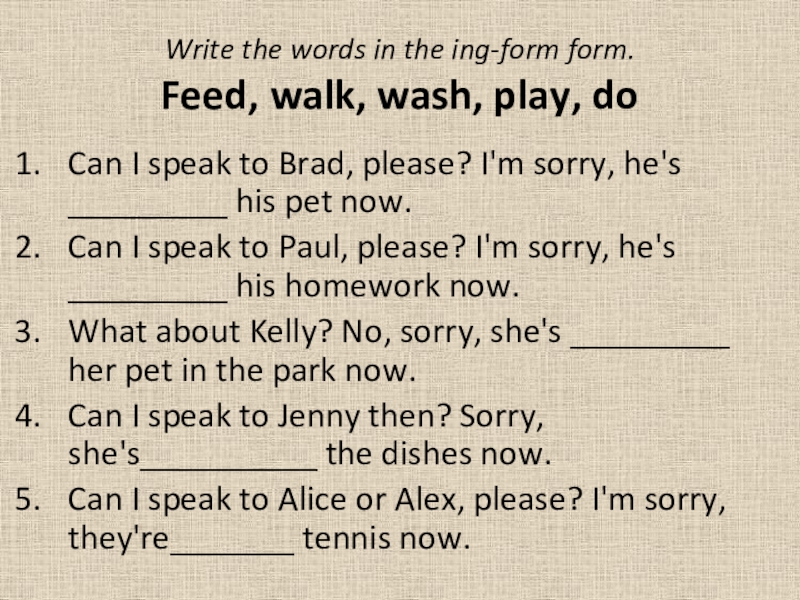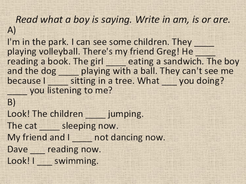 I'm in the park. I can see some children. They ____ playing volleyball. There's my friend Greg! He ____ reading a book. The girl ____ eating a sandwich. The boy and the dog ____ playing with a ball. They can't see me because I ____ sitting in a tree. What ___ you doing? ____ you listening to me?