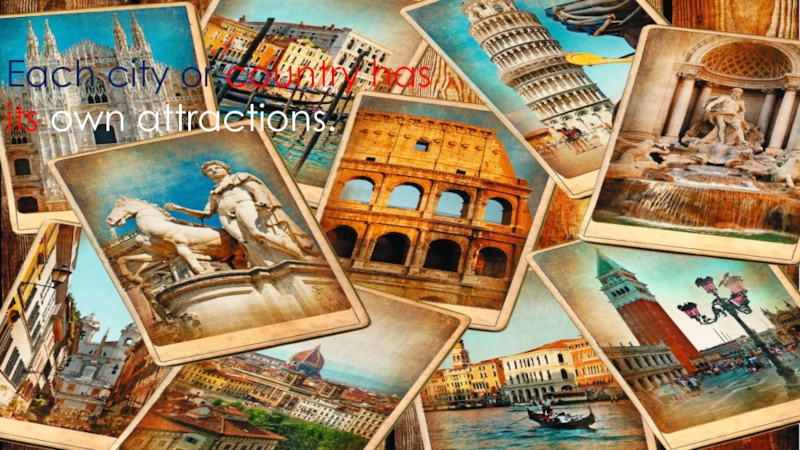 Слайд 9Each city or country has its own attractions.