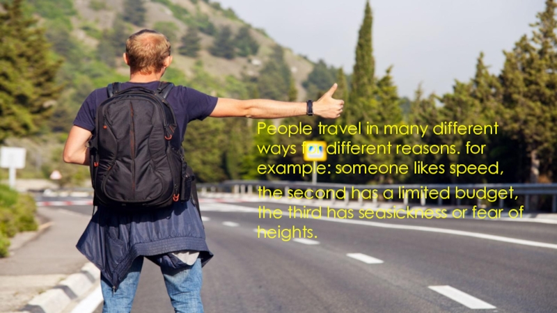 Слайд 3People travel in many different ways for different reasons. for example:
