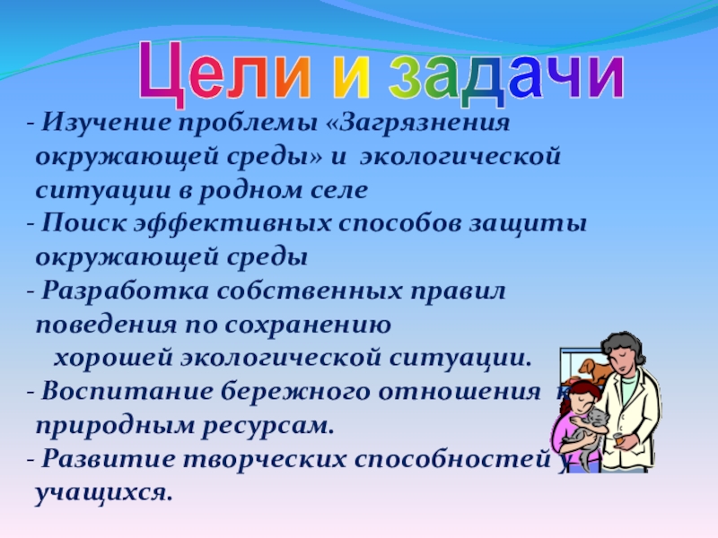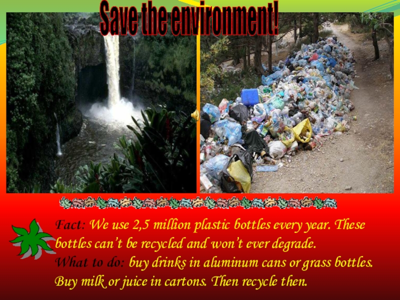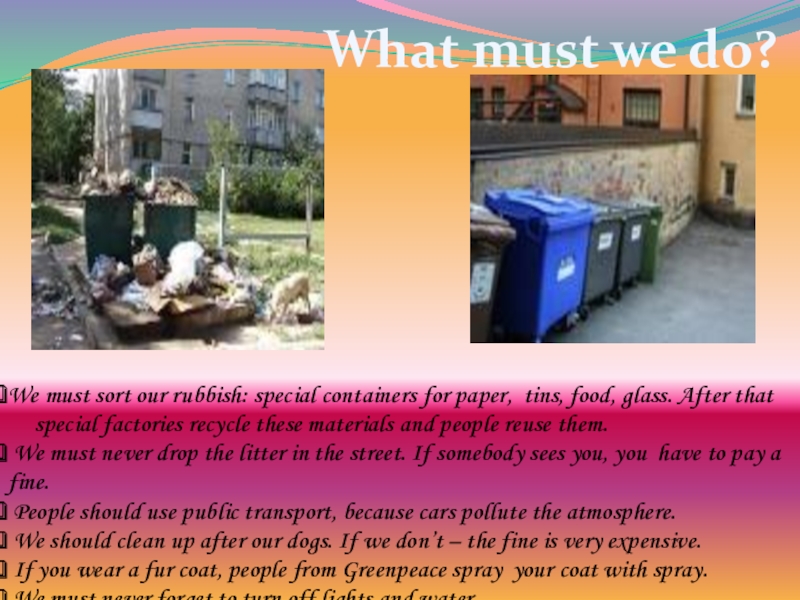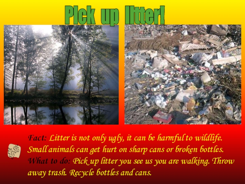 We cleaning lakes and rivers, planting trees, studying nature and the effects of pollution, pick up cans and paper
