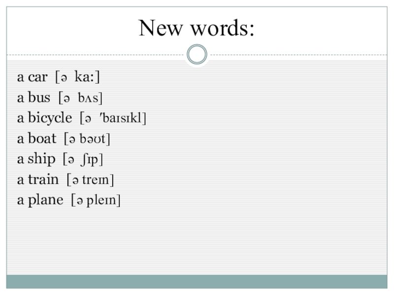 New words:a car [ə ka:]a bus [ə bʌs]a bicycle [ə ʹbaɪsɪkl]a boat [ə bəʊt]a ship [ə ʃɪp]a