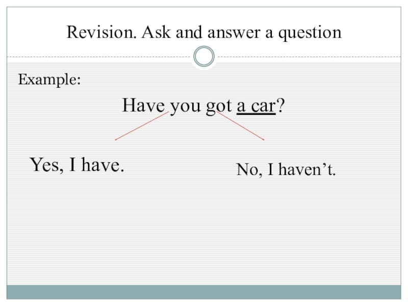 Revision. Ask and answer a questionExample:Have you got a car?Yes, I have.No, I haven’t.