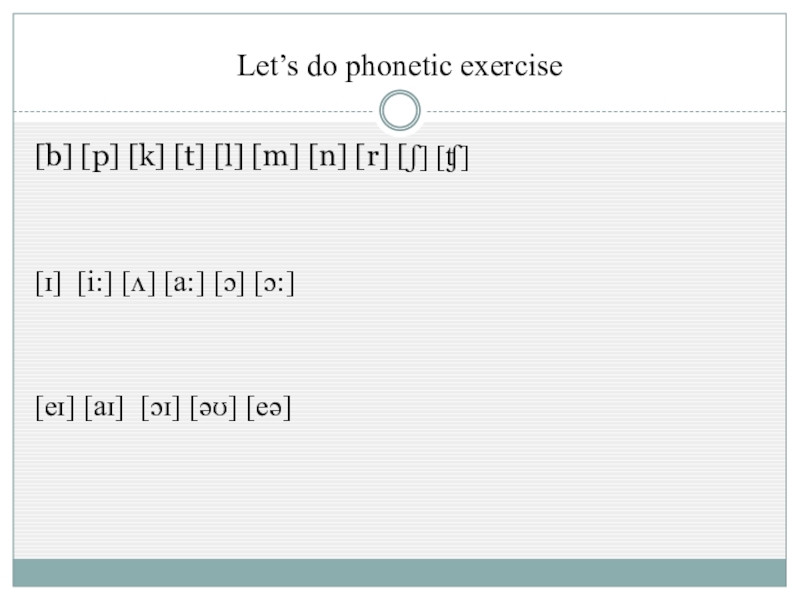 Let’s do phonetic exercise[b] [p] [k] [t] [l] [m] [n] [r] [ʃ] [ʧ][ɪ] [i:] [ʌ] [a:] [ɔ] [ɔ:][eɪ] [aɪ] [ɔɪ] [əʊ] [eə]