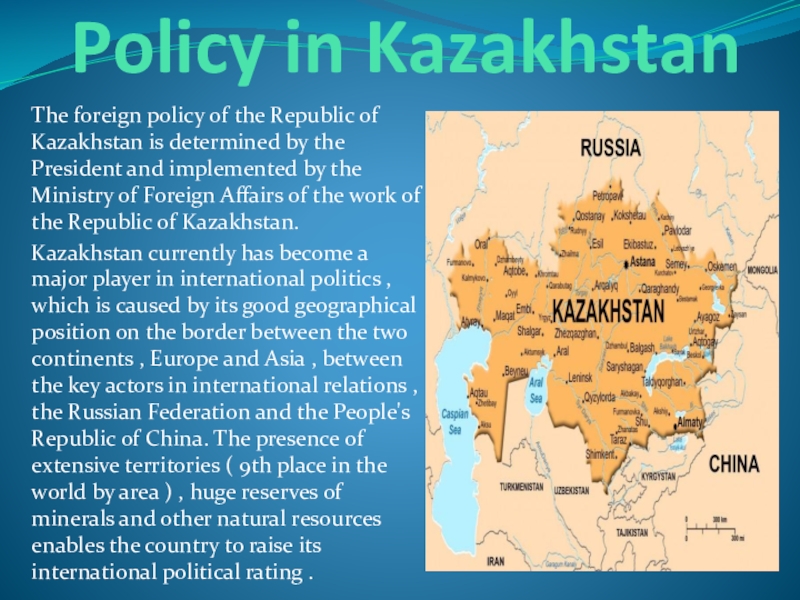 Policy in KazakhstanThe foreign policy of the Republic of Kazakhstan is determined by the President and implemented by the Ministry of Foreign Affairs of the work of the Republic of Kazakhstan. Kazakhstan currently has become a
