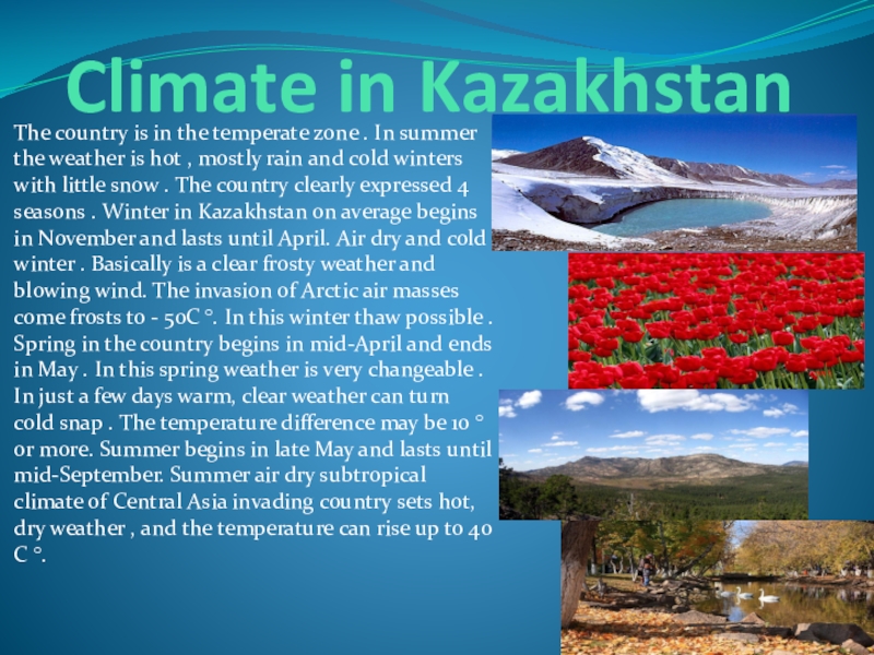 summer the weather is hot , mostly rain and cold winters with little snow . The country clearly expressed 4 seasons . Winter in Kazakhstan on average begins in November and lasts until April. Air dry and cold winter . Basically is a clear frosty weather and blowing wind. The invasion of Arctic air masses come frosts to - 50C °. In this winter thaw possible . Spring in the country begins in mid-April and ends in May . In this spring weather is very changeable . In just a few days warm, clear weather can turn cold snap . The temperature difference may be 10 ° or more. Summer begins in late May and lasts until mid-September. Summer air dry subtropical climate of Central Asia invading country sets hot, dry weather , and the temperature can rise up to 40 C °.