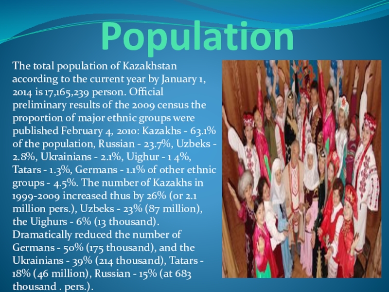 January 1, 2014 is 17,165,239 person. Official preliminary results of the 2009 census the proportion of major ethnic groups were published February 4, 2010: Kazakhs - 63.1% of the population, Russian - 23.7%, Uzbeks - 2.8%, Ukrainians - 2.1%, Uighur - 1 4%, Tatars - 1.3%, Germans - 1.1% of other ethnic groups - 4.5%. The number of Kazakhs in 1999-2009 increased thus by 26% (or 2.1 million pers.), Uzbeks - 23% (87 million), the Uighurs - 6% (13 thousand). Dramatically reduced the number of Germans - 50% (175 thousand), and the Ukrainians - 39% (214 thousand), Tatars - 18% (46 million), Russian - 15% (at 683 thousand . pers.).