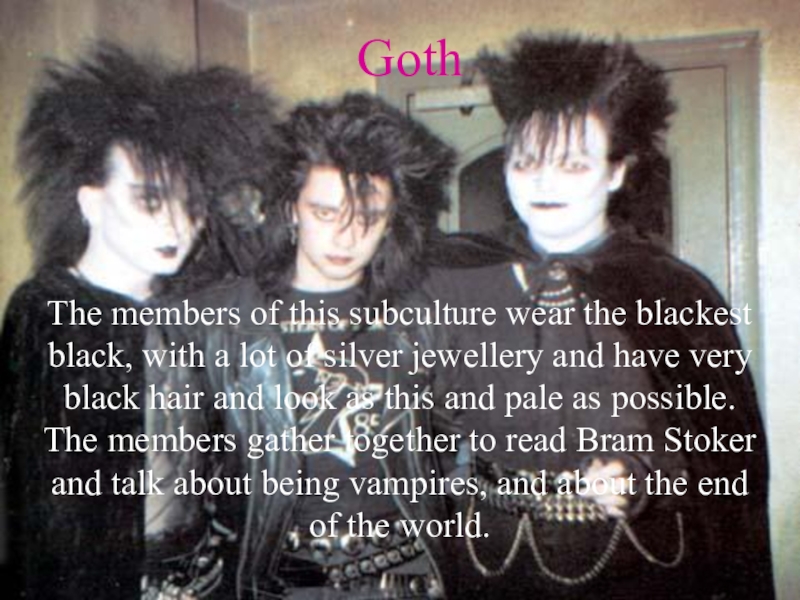 The members of this subculture wear the blackest black, with a lot of silver jewellery and have very black hair and look as this and pale as possible. The members gather together to read Bram Stoker and talk about being vampires, and about the end of the world.