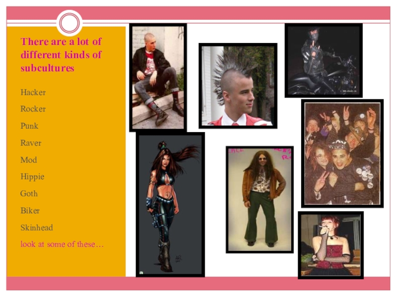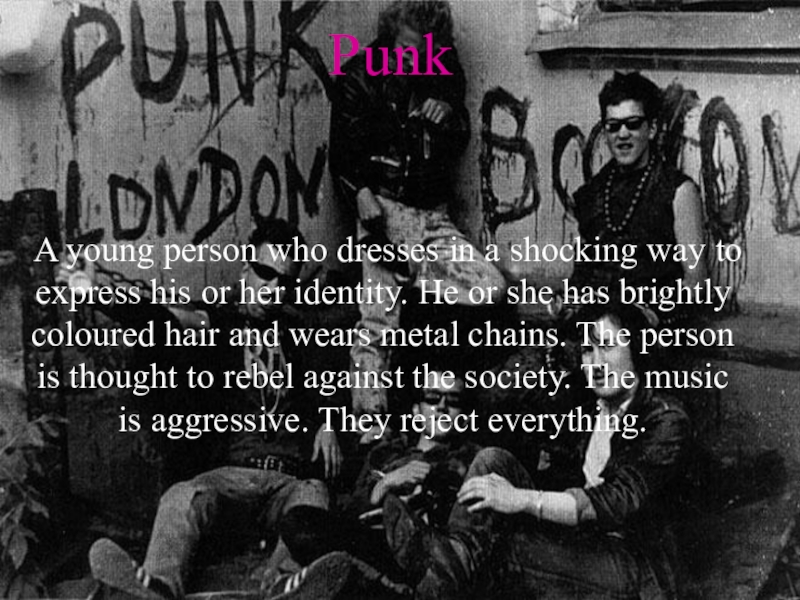 A young person who dresses in a shocking way to express his or her identity. He or she has brightly coloured hair and wears metal chains. The person is thought to rebel against the society. The music is aggressive. They reject everything.