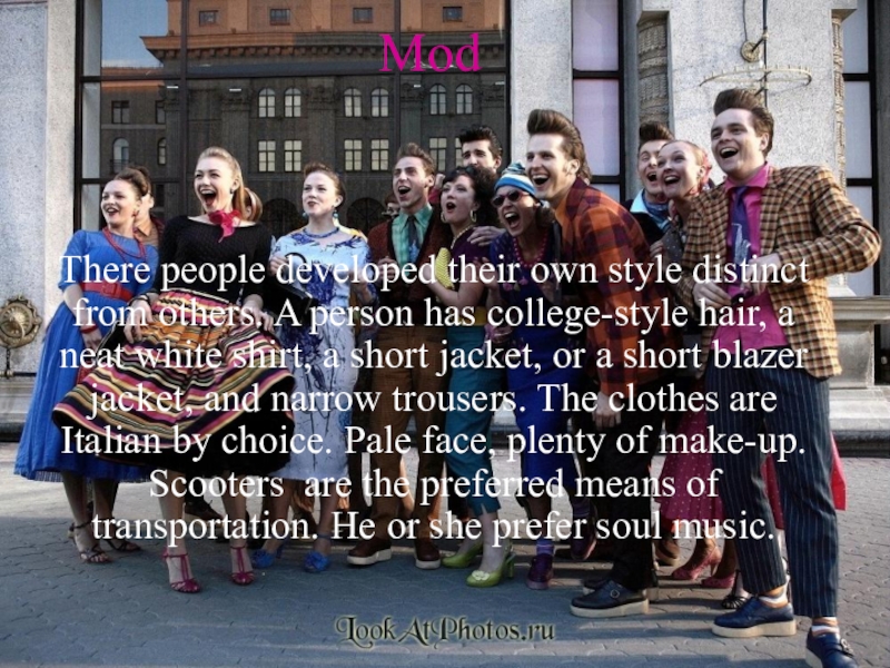 There people developed their own style distinct from others. A person has college-style hair, a neat white shirt, a short jacket, or a short blazer jacket, and narrow trousers. The clothes are Italian by choice. Pale face, plenty of make-up. Scooters are the preferred means of transportation. He or she prefer soul music.