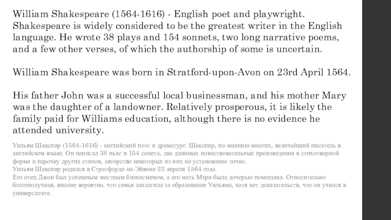 Уильям Шекспир (1564-1616) - английский поэт и драматург. Шекспир, по мнению многих, величайший писатель в английском языке. Он написал 38 пьес и 154 сонета, два длинных повествовательных произведения в стихотворной форме и парочку других стихов, авторство некоторых из них не установлено точно.