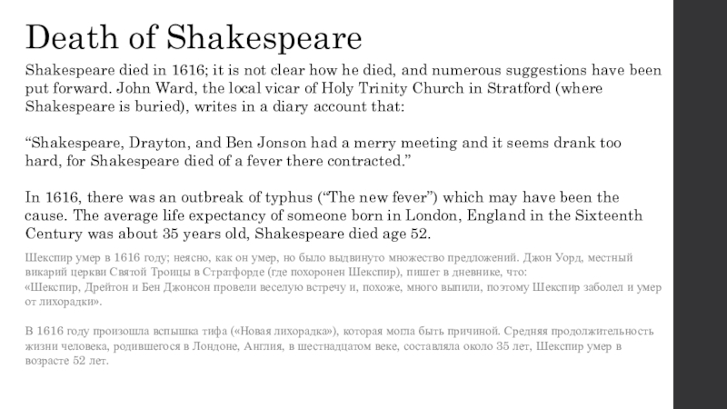 Шекспир умер в 1616 году; неясно, как он умер, но было выдвинуто множество предложений. Джон Уорд, местный викарий церкви Святой Троицы в Стратфорде (где похоронен Шекспир), пишет в дневнике, что: