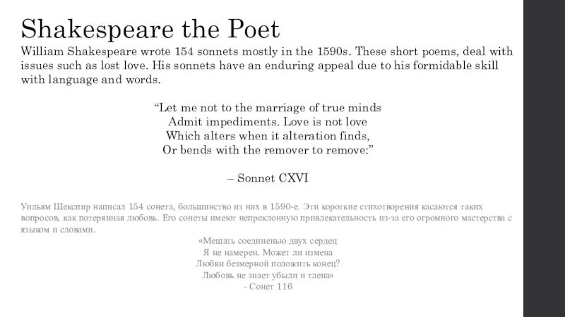 Уильям Шекспир написал 154 сонета, большинство из них в 1590-е. Эти короткие стихотворения касаются таких вопросов, как потерянная любовь. Его сонеты имеют непреклонную привлекательность из-за его огромного мастерства с языком и словами.
