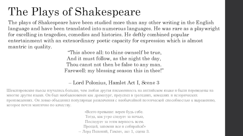 Шекспировские пьесы изучались больше, чем любая другая письменность на английском языке и были переведены на многие другие языки. Он был необыкновенен как драматург, преуспел в трагедиях, комедиях и исторических произведениях. Он ловко объединил популярные развлечения с необычайной поэтической способностью к выражению, которое почти мантично по качеству.