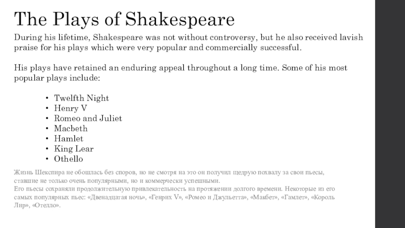 Жизнь Шекспира не обошлась без споров, но не смотря на это он получил щедрую похвалу за свои пьесы, ставшие не только очень популярными, но и коммерчески успешными.
