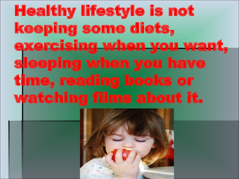 Слайд 18Healthy lifestyle is not keeping some diets, exercising when you want,