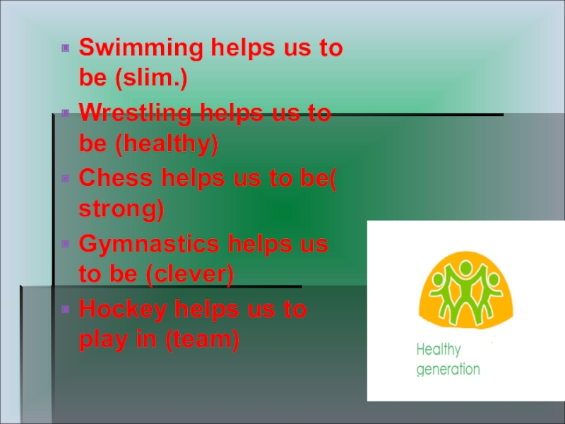 Swimming helps us to be (slim.)Wrestling helps us to be (healthy)Chess helps