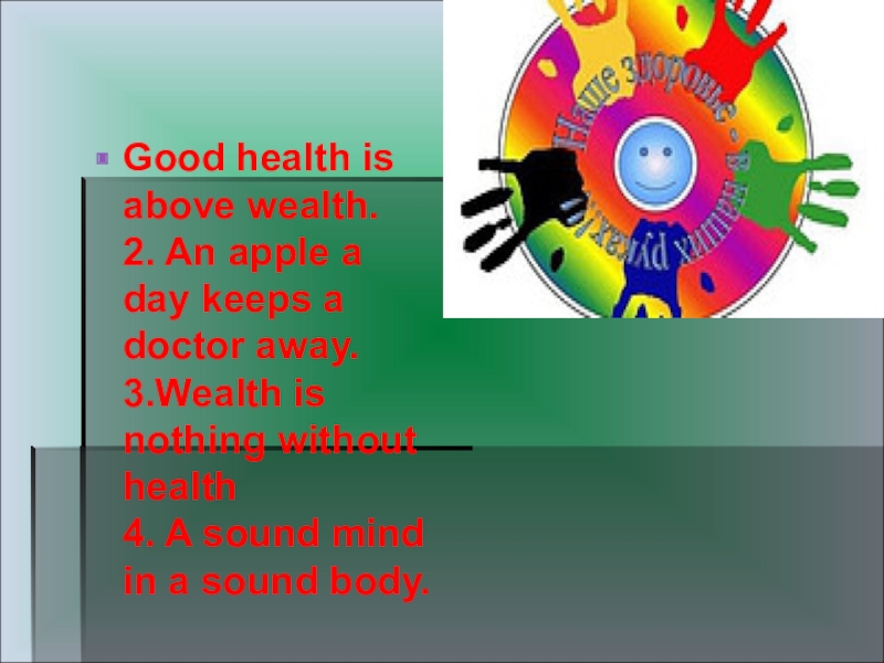 Good health is above wealth. 2. An apple a day keeps a doctor away. 3.Wealth is nothing