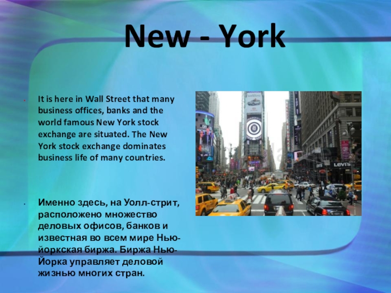 Именно здесь, на Уолл-стрит, расположено множество деловых офисов, банков и известная во всем мире Нью-йоркская биржа. Биржа Нью-Йорка управляет деловой жизнью многих стран.