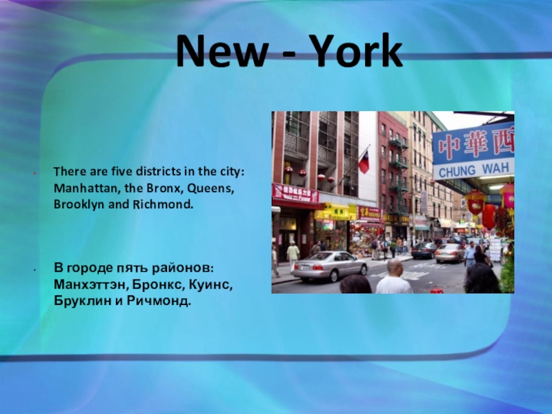В городе пять районов: Манхэттэн, Бронкс, Куинс, Бруклин и Ричмонд.