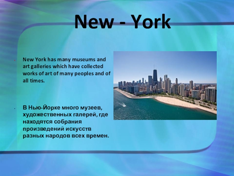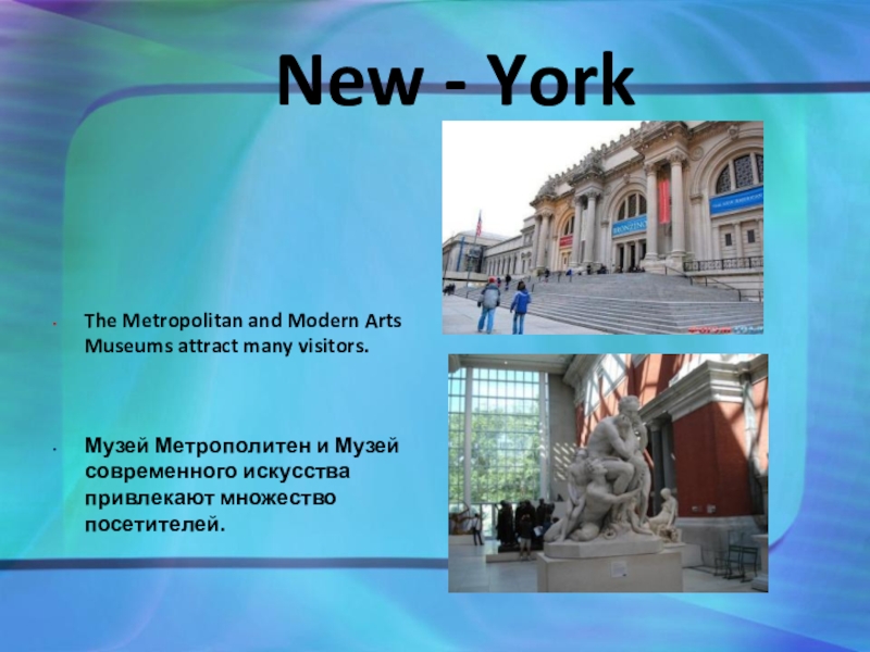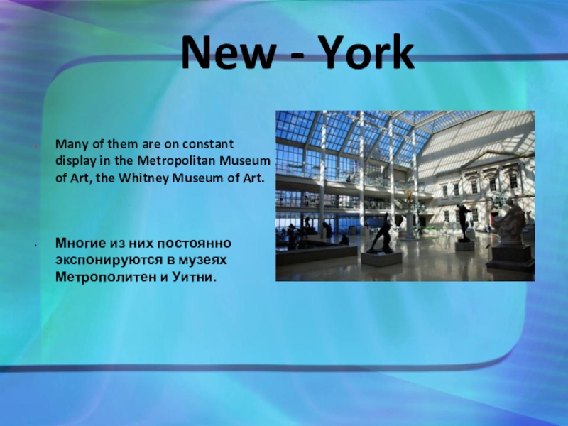 В Нью-Йорке много музеев, художественных галерей, где находятся собрания произведений искусств разных народов всех времен.
