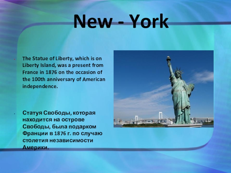 Статуя Свободы, которая находится на острове Свободы, была подарком Франции в 1876 г. по случаю столетия независимости Америки.