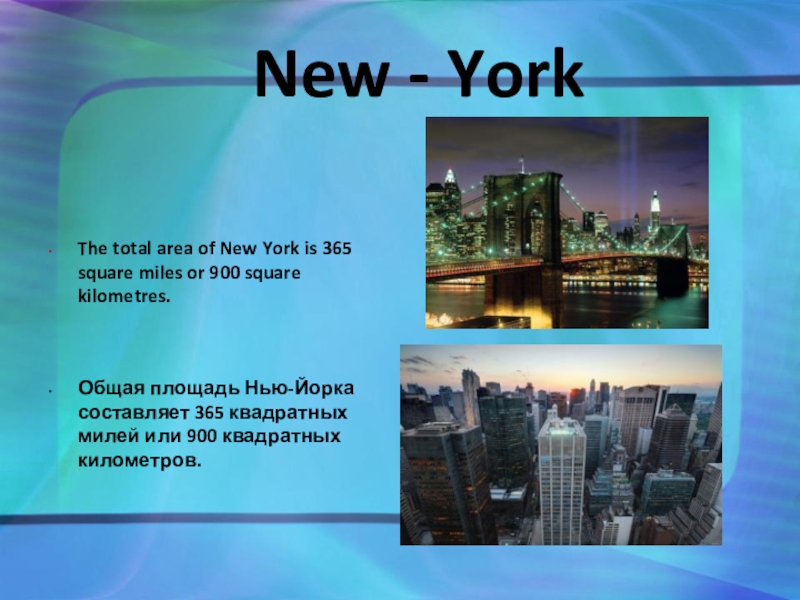 Общая площадь Нью-Йорка составляет 365 квадратных милей или 900 квадратных километров.