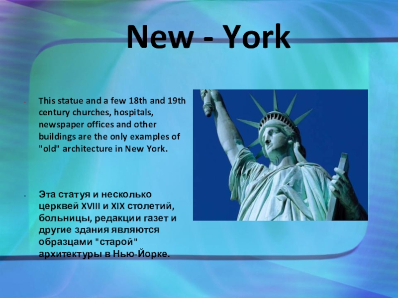 Эта статуя и несколько церквей XVIII и XIX столетий, больницы, редакции газет и другие здания являются образцами "старой" архитектуры в Нью-Йорке.