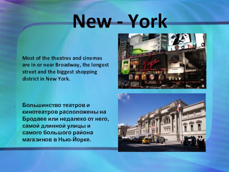 and cinemas are in or near Broadway, the longest street and the biggest shopping district in New York.